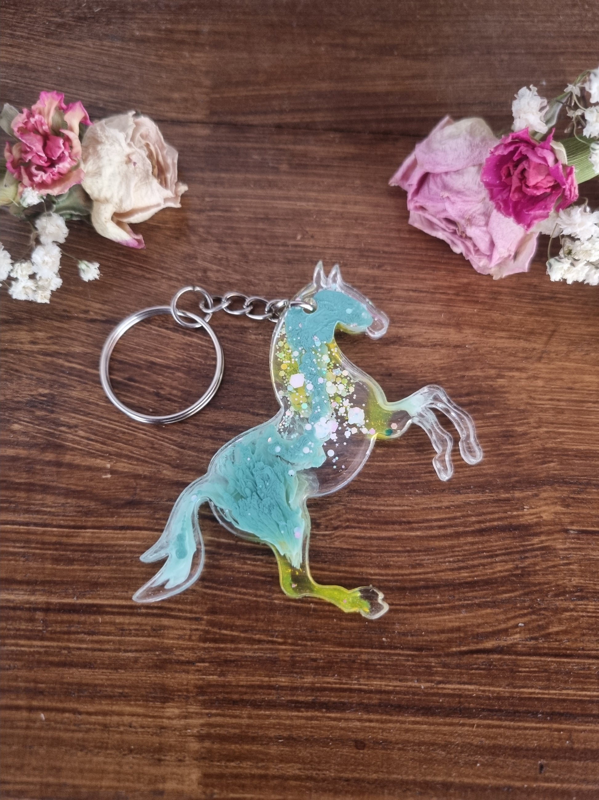 Der Schlüsselanhänger Pferd wurde aus Epoxidharz hergestellt.