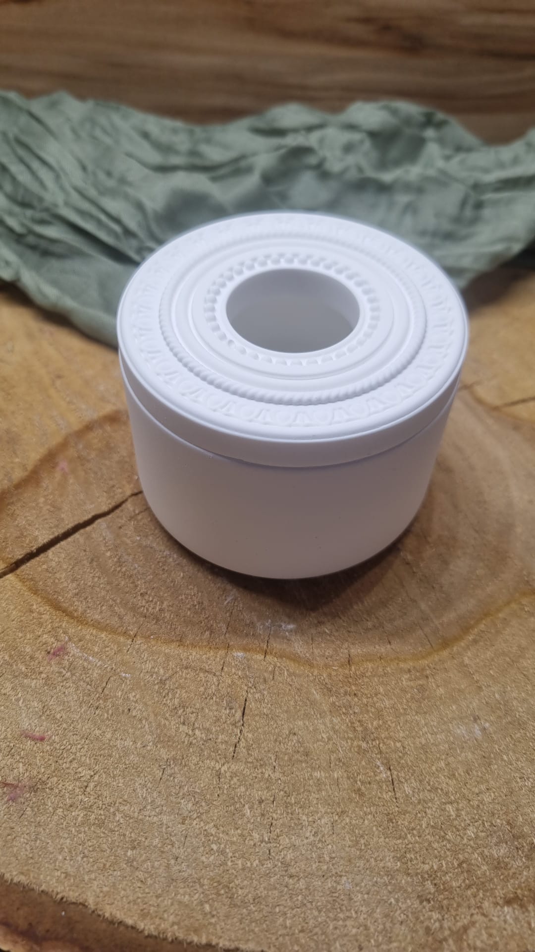 Dieser schlichte Teelichthalter hat einen wunderschön verzierten Deckel.